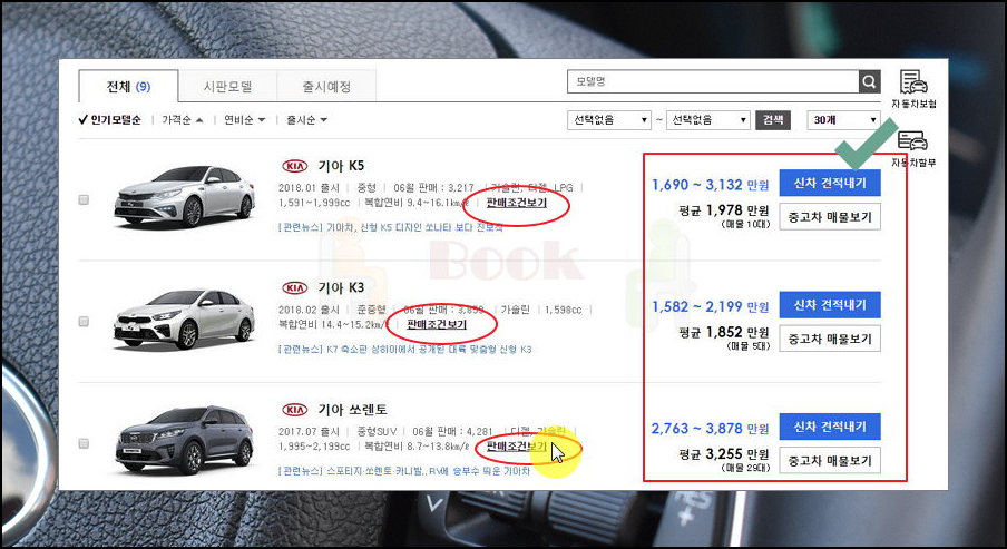 저는 인기 많은 준중형, 중형, 중형 SUV 차종별 기아 자동차 검색을 해보았어요. 리스트를 통해 간략하게 기아 자동차 차종별 가격표가 나타나는데요. 신차 구입 금액과 함께 중고차 매물의 평균 시세도 확인하실 수 있어요. 이번 달 기아자동차 판매조건을 확인하고 싶은 분들은 차량 소개에 포함되어 있는 '판매조건보기'를 클릭해 보세요.