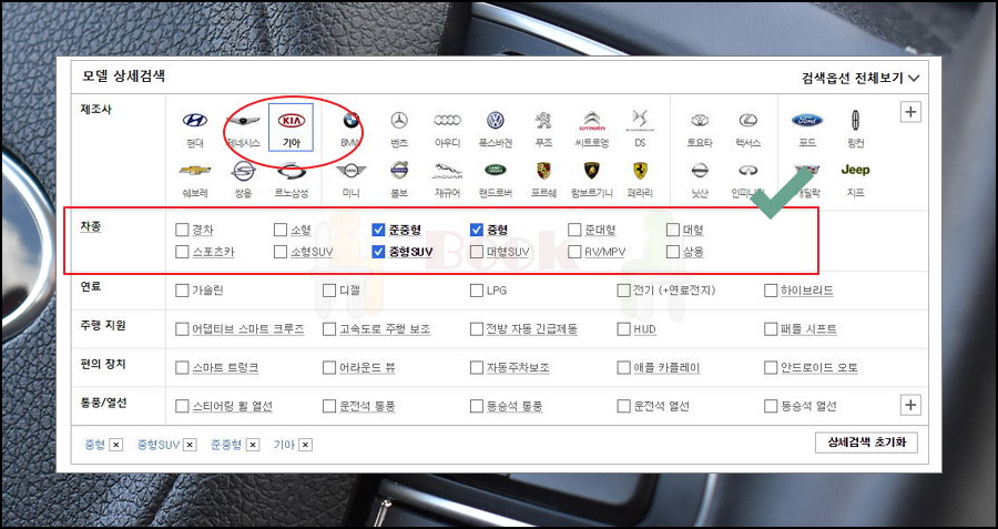 메뉴에서 신차를 클릭하면 이렇게 모델 상세검색 페이지가 열리는데요. 제조사를 기아로 선택한 후 원하는 차종을 선택해 주세요. 차종별로 경차, 소형, 준중형, 중형, 준대형, 대형, 소형 SUV, 중형 SUV, 대형 SUV, 상용차 등으로 구분하실 수 있어요. 차종별 외에 연료, 주행지원, 편의 장치 등 원하는 옵션을 선택할 수 있으니 참고해 주세요.