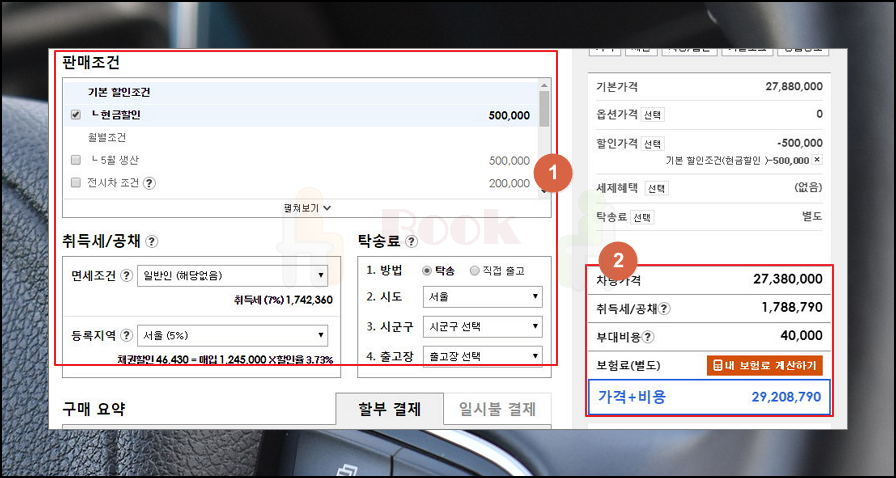 옵션과 세부모델을 지정하셨다면 본인이 이용할 수 있는 판매조건을 선택해야 하는데요. 해당하는 판매조건을 지정하면 자동차 구매 시 내야 하는 비용이 자동으로 할인돼요. 부수적으로 발생하는 취득세, 탁송료, 공채까지 입력하면 최종 금액이 떠요. 실제로 기아자동차를 구매할 때의 비용과 거의 같을 거에요.