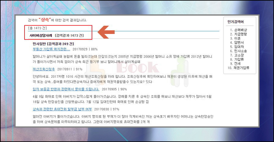 상속에 대한 사례만 1473건이나 됩니다. 최근 1년 동안 법률상담센터에서 진행한 것들인데요. 제목과 내용을 보고 본인이 겪고 있는 문제와 유사한 것을 찾으시면 됩니다. 모두 무료로 읽을 수 있어요.
