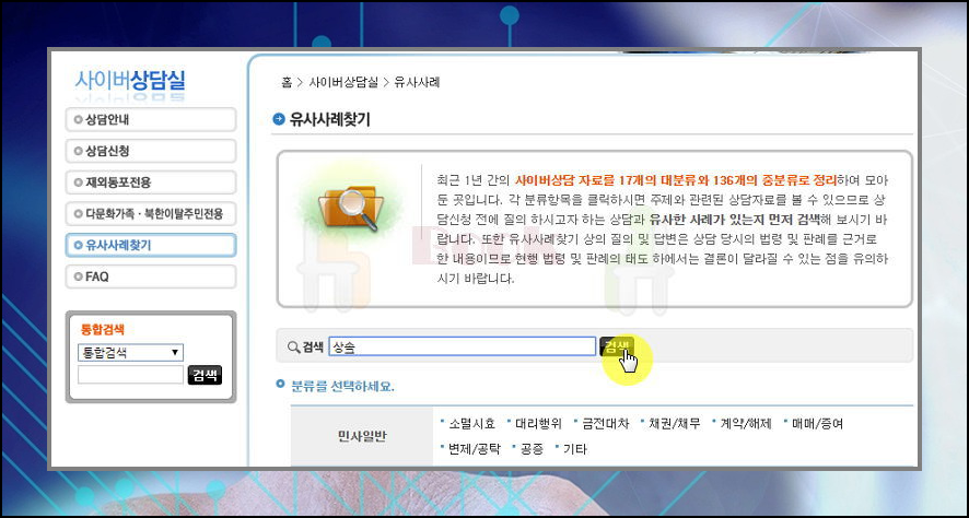 당장 빠른 답변을 받아보고 싶으신 분들은 유사사례찾기 서비스를 이용해보세요. 본인이 겪고 있는 일과 유사한 사례를 찾아볼 수 있습니다. 보통 많은 분들이 이혼, 상속, 부동산, 금전거래에 관련된 문제를 많이 겪는데요. 이에 대한 센터의 사례는 정말 많습니다.