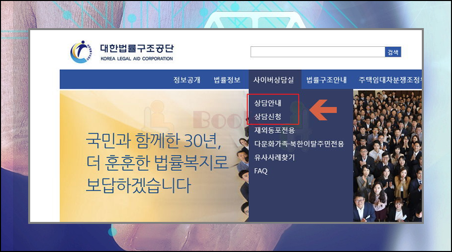 홈페이지를 보시면 아시겠지만, 무료 법률상담센터의 역할을 하기도 하지만, 법률구조를 하거나 주택임대차분쟁조정위원회를 운영하는 등 사회를 위하여 다양한 일을 하고 있는데요. 이번 시간에는 법률상담을 받는 것을 중심으로 살펴보겠습니다.