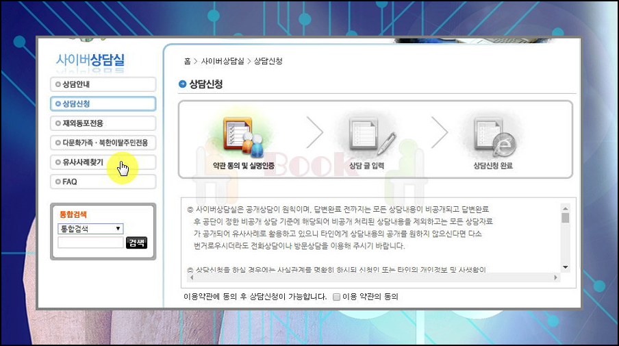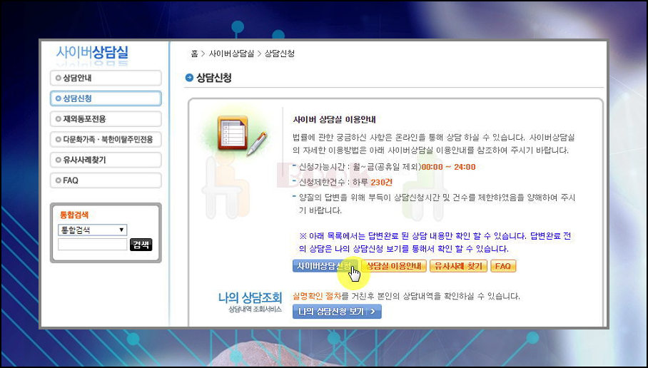 이곳곳에서는 사이버 및 방문 상담을 받고 있는데요. 생각을 조리있게 정리하고, 시간을 절약하기 위해서는 온라인 서비스를 이용하는 것이 편리합니다. 물론 무료로 이용할 수 있는데요. 평일에 홈페이지에 접속하여 신청' 버튼을 누르시면 됩니다.