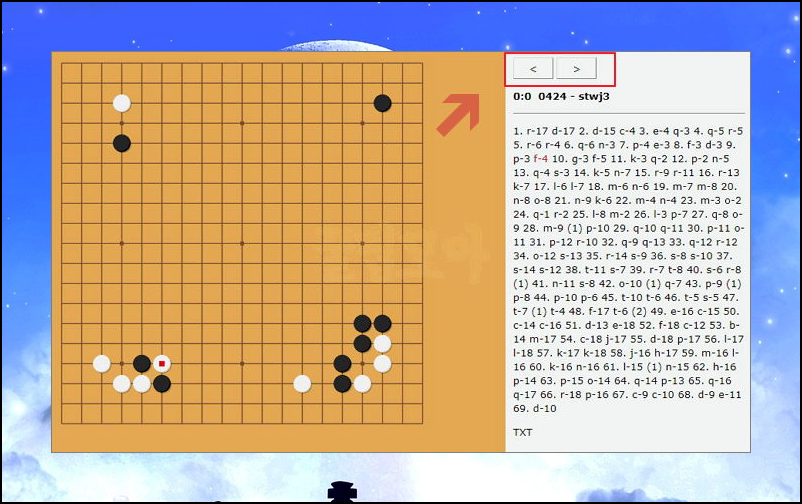 방향키를 누르면 바둑게임의 진행 상황을 볼 수 있습니다. 이런 것을 리플레이라고도 하는데요. 바둑 실력을 높이고 싶다면 본인과 잘하는 사람의 리플레이를 보고 배우는 것은 필수입니다.