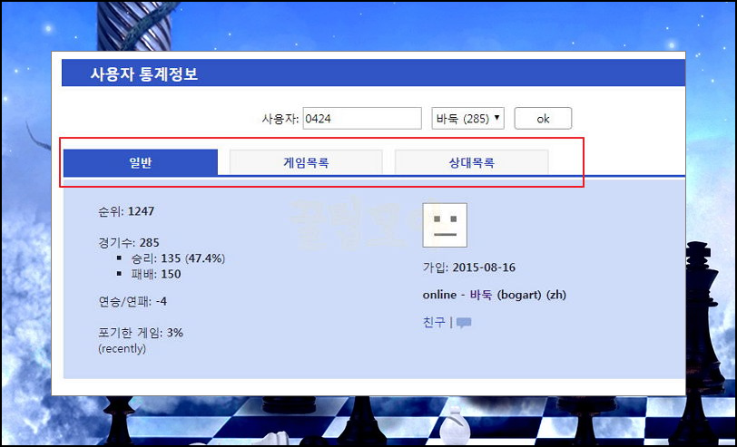 상세한 정보를 보면 순위, 경기 수, 가입일 등을 알아보거나 친구 맺기가 가능합니다. 즐겁게 게임하기 좋은 기능이에요.