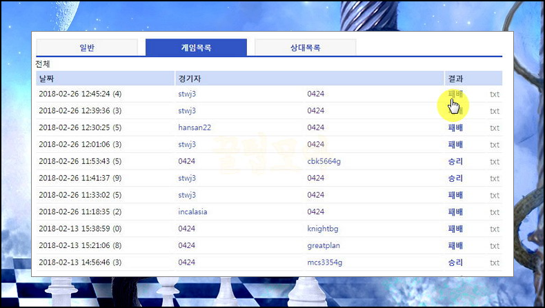 해당 아이디의 소유자가 언제 누구와 같이 게임하기 시작했고, 결과는 어떠한지 알 수 있습니다. 결과를 클릭하면 게임 내용도 볼 수 있어요.
