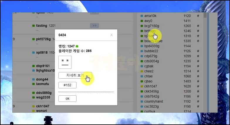 아이디를 클릭하면 해당 아이디의 이력을 볼 수 있는데요. 실력이 좋은 사람이 어떤 식으로 게임을 진행하는지 알아보기 좋습니다.