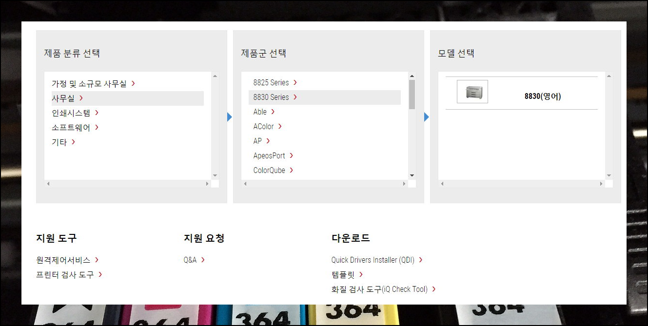 저는 후지제록스의 사무실용 8830 Series를 찾아 보았습니다. 해당 후지제록스 프린터의 이미지까지 확인할 수 있는데요. 이미지를 더블 클릭하면 드라이버 설치 파일이 있는 웹페이지로 이동하게 됩니다.