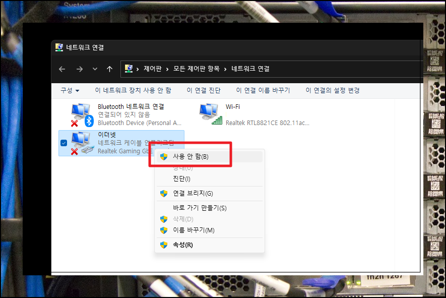 이곳에서도 우리가 사용하는 네트워크 연결 관련된 어댑터가 나타나는데요. 사용하는 어댑터 아이콘에 대하여 마우스 우클릭을 해보세요. 그럼 연결 또는 사용을 선택할 수 있는 메뉴가 나타납니다. 혹시 사용이 되지 않거나 연결이 안될때 해당 메뉴를 눌러 주세요.