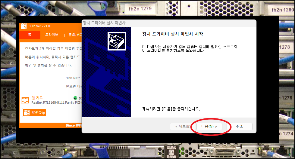 제품명을 클릭하면 장치 드라이버 설치 마법사가 시작이 되는데요. 이 마법사는 랜카드에 알맞는 드라이버를 설치하도록 도와줍니다. 안내 문구를 보고 "다음" 버튼만 누르면 될 정도로 쉽게 진행이 가능합니다. 드라이버가 제대로 설치되면 네트워크 문제가 해결이 될 거에요.