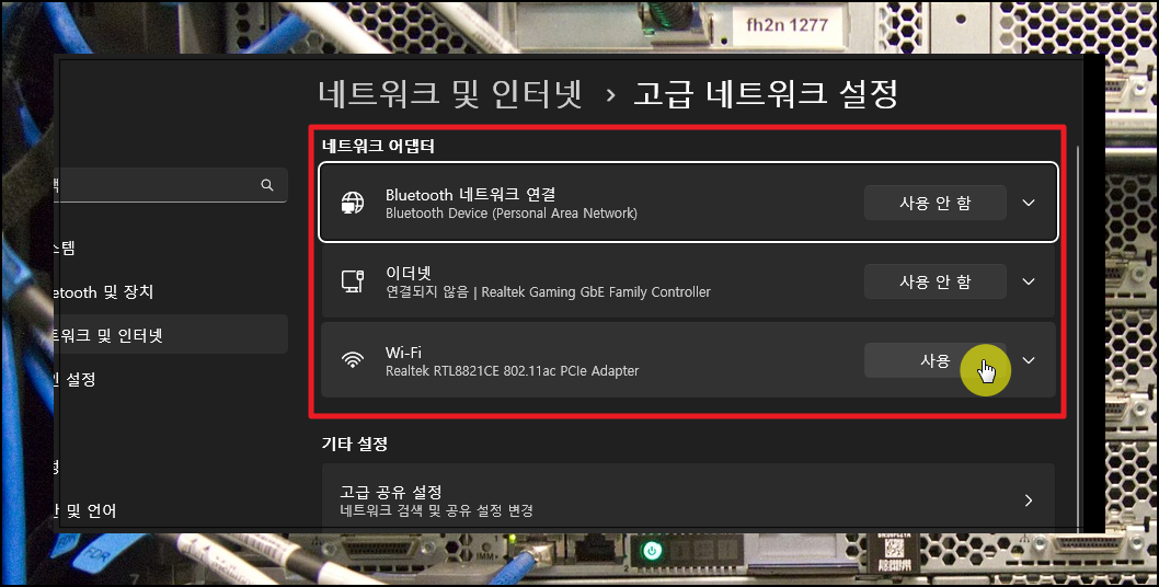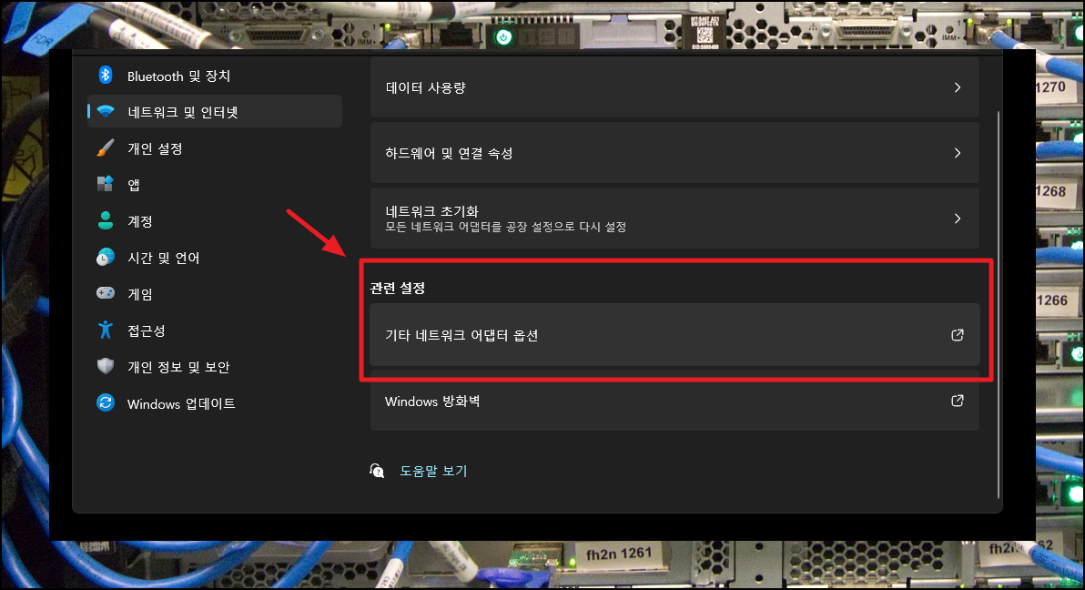 고급 네트워크 설정 창에서 화면 아랫부분을 보면 관련 설정 카테고리가 있습니다. 여기에서 기타 네트워크 어댑터 옵션을 선택해 주세요.