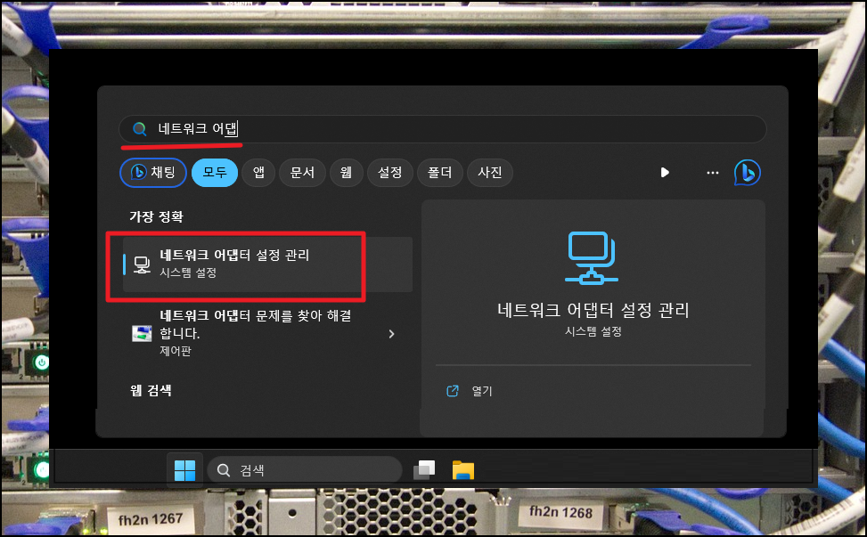 윈도우에서 시작 버튼을 누른 상태에서 " 네트워크 어댑터" 라고 입력을 해 보세요. 그럼 어댑터 설정 관리 메뉴가 나타납니다. 해당 메뉴를 선택해 주세요.