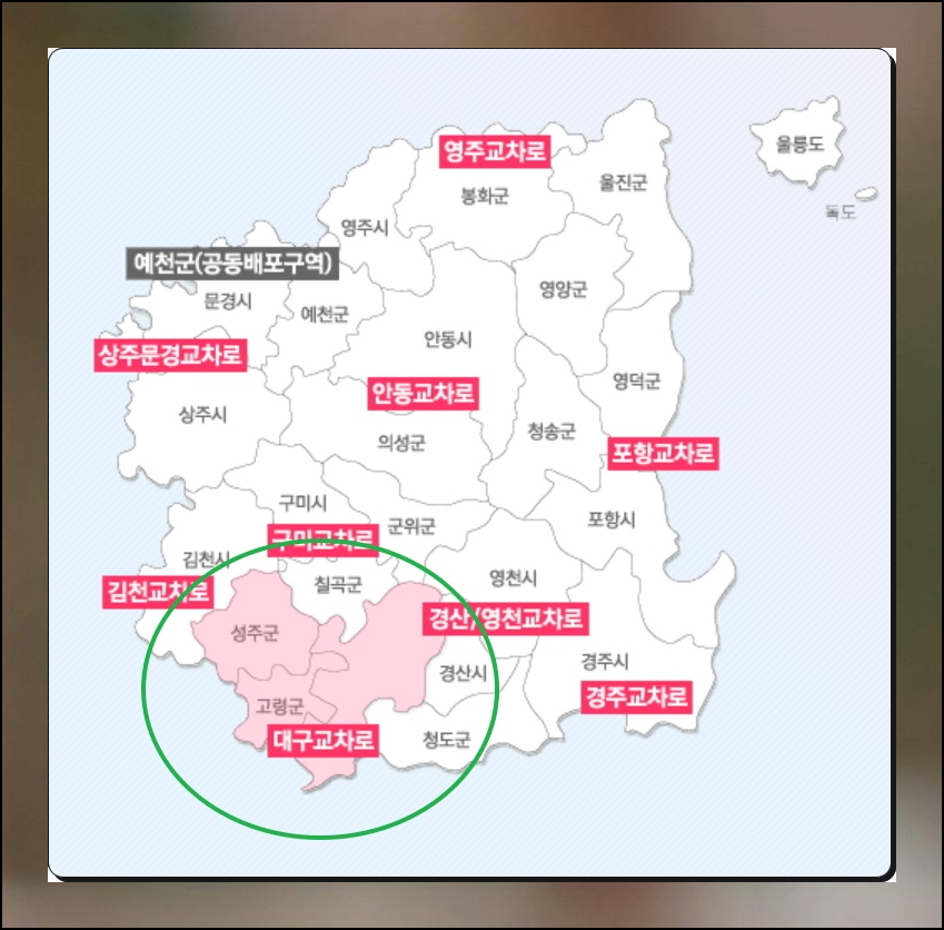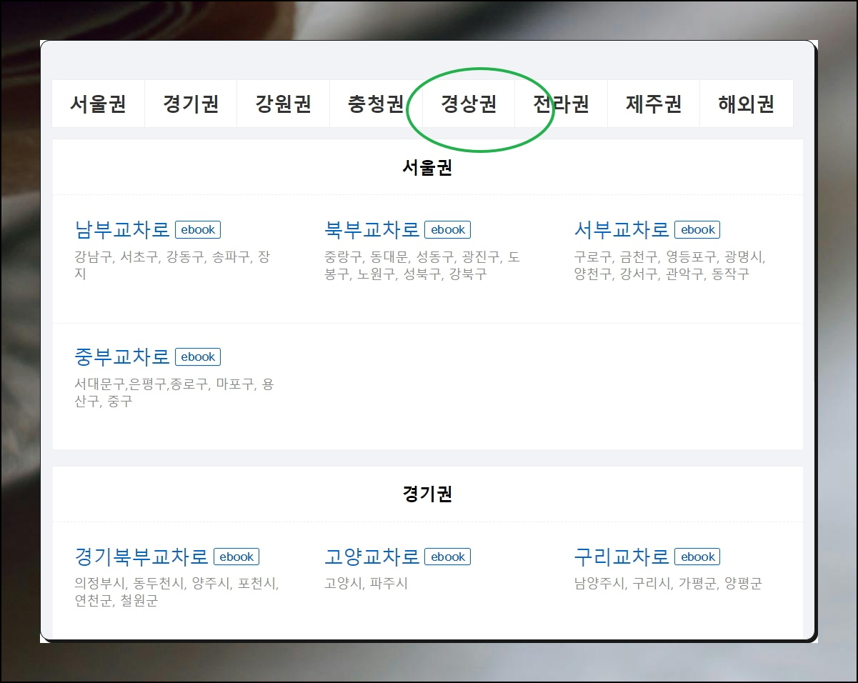 교차로의 경우에는 크게 서울권, 경기권, 강원권, 충청권, 경상권, 전라권, 제주권, 해외권 이렇게 8개로 나뉘어져 있습니다. 여기서 [경상권]을 선택해야 하는데요. 경상권에 속한 지역을 살펴보면 아시겠지만, 대구 교차로는 찾아볼 수 없습니다.