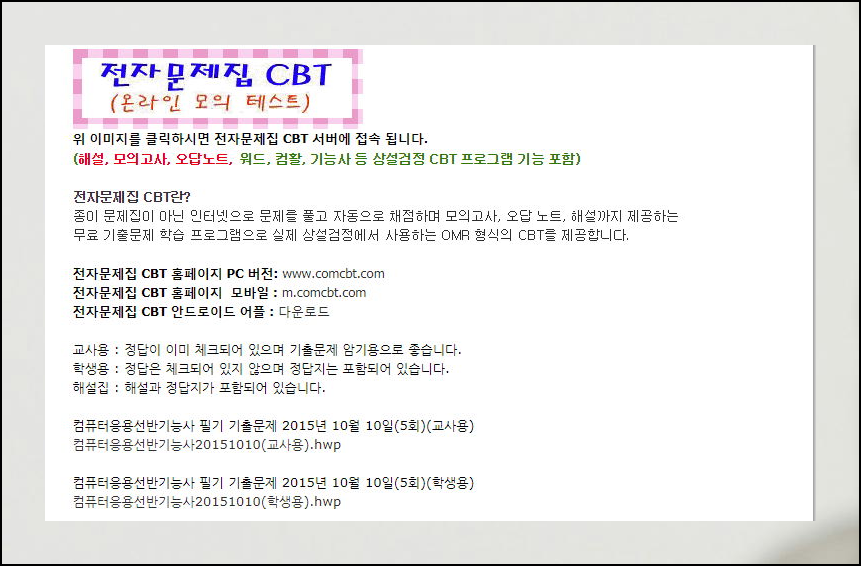 인터넷을 통해 여러 자격증 시험을 준비할 때 유용하게 사용할 수 있는 기출문제를 얻을 수 있습니다. 보통 자격증의 필기 시험은 문제은행식인 경우가 많은데요. 기출문제를 반복해서 풀면 대부분 쉽게 합격하실 수 있습니다. 그럼 검색을 통해 comcbt 공식 사이트에 접속해 주세요.