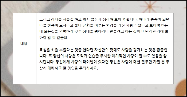 선택하신 카드의 종류와 방향이 먼저 공개됩니다. 예를 들어 세계, 매달린남자, 무너지는탑이라는 조합이 나왔다면 연애 부분에서 주의가 필요하다는 신호일 수 있어요. 이러한 예견을 통해 미리 대비하고 현명하게 대처하시면 됩니다.