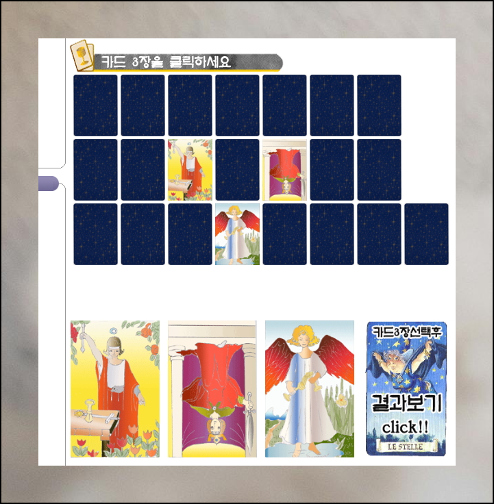 펼쳐진 카드들 중에서 총 3장을 선택하게 됩니다. 어떤 카드를 고르느냐에 따라 타로점의 결과가 달라지니 신중하게 선택해주세요. 무료임에도 불구하고 전문적인 해석을 받아보실 수 있습니다. 카드 선택이 끝나면 결과보기를 통해 상세한 운세를 확인할 수 있어요.