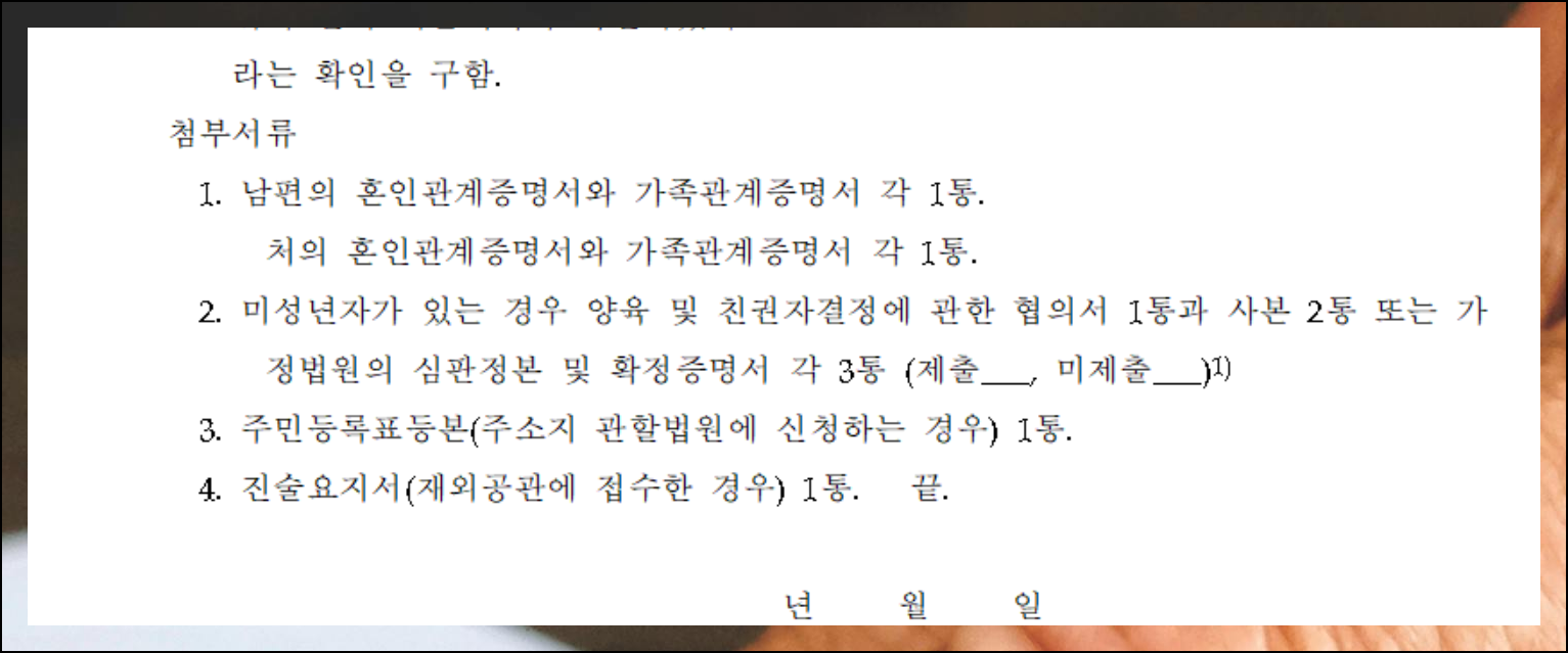 법원에는 이혼서류 신청을 위한 기본 양식이 구비가 되어 있어요. 하지만 이혼 유형에 따라 추가로 필요한 문서들이 있습니다. 대부분의 이혼서류는 동사무소를 통해해 발급 받을 수 있으니 걱정하지 마세요. 동사무소 방문 시 신분증을 꼭 지참 하셔야 합니다.