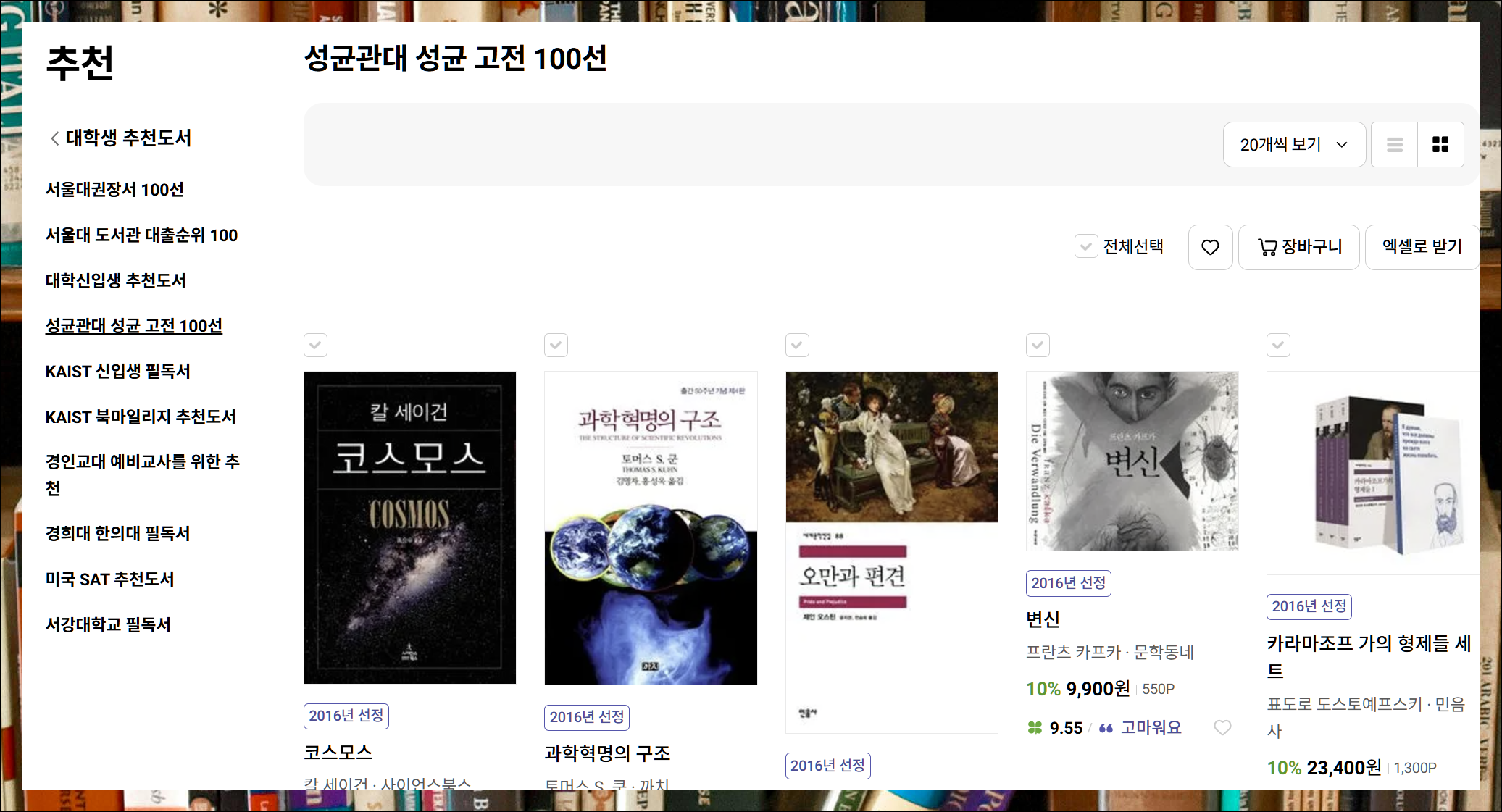 읽어야 할 책이 100권만 있는 것이 아니에요. 대학생 추천 메뉴에는 서울대 도서관 인기 순위, 서울대 권장도서, 예비 교사 필독서, 성균관대 고전 등 여러 테마별 목록이 준비되어 있습니다. 원하는 분야의 도서를 찾아보세요.