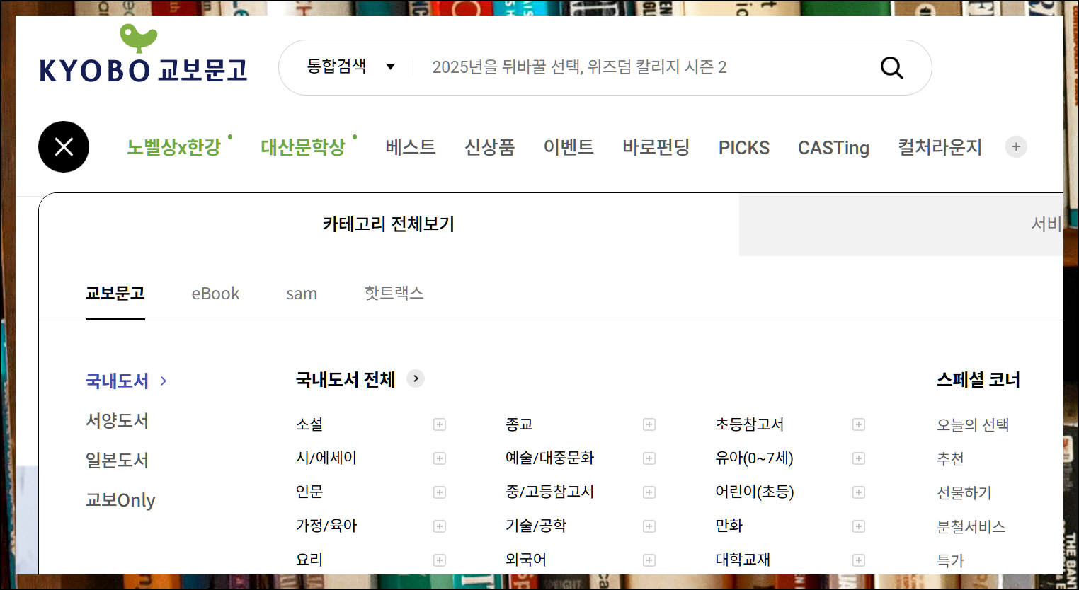 교보문고 홈페이지는 베스트셀러와 이벤트 정보를 한눈에 보여줍니다. 메뉴 전체보기에서 국내도서로 들어가면 스페셜 코너가 있어요. 이곳의 추천도서 섹션에서 꼭 읽어야 할 다양한 책 목록을 확인할 수 있습니다.