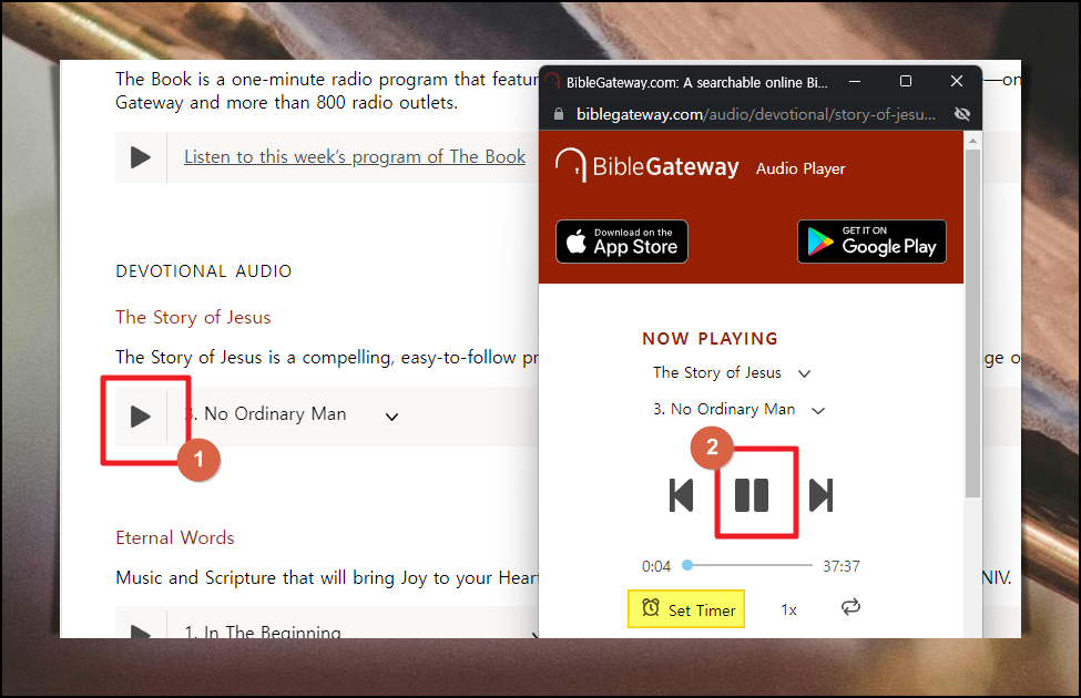 선택한 부분의 재생 버튼을 누르면 새로운 창이 뜹니다. 이 창에서 다시 한 번 재생 버튼을 누르면 무료듣기 서비스가 진행돼요. Set Timer 기능으로 청취 시간도 설정할 수 있습니다.