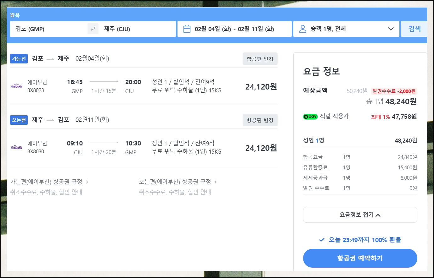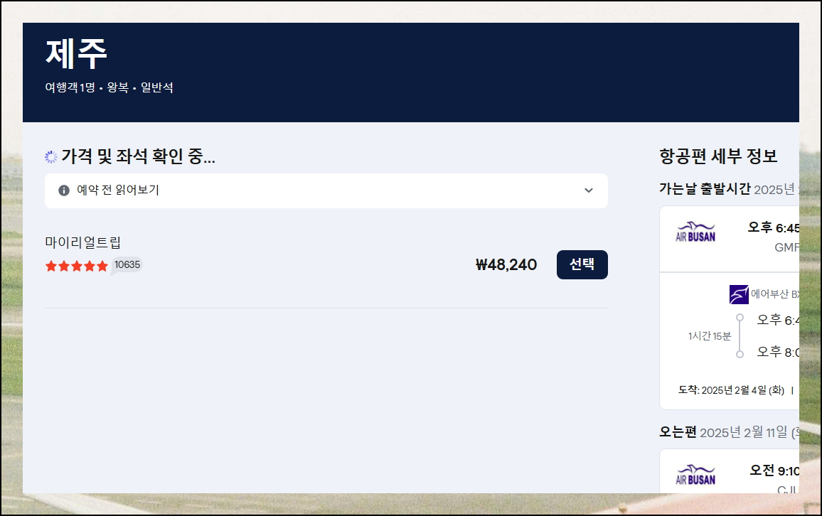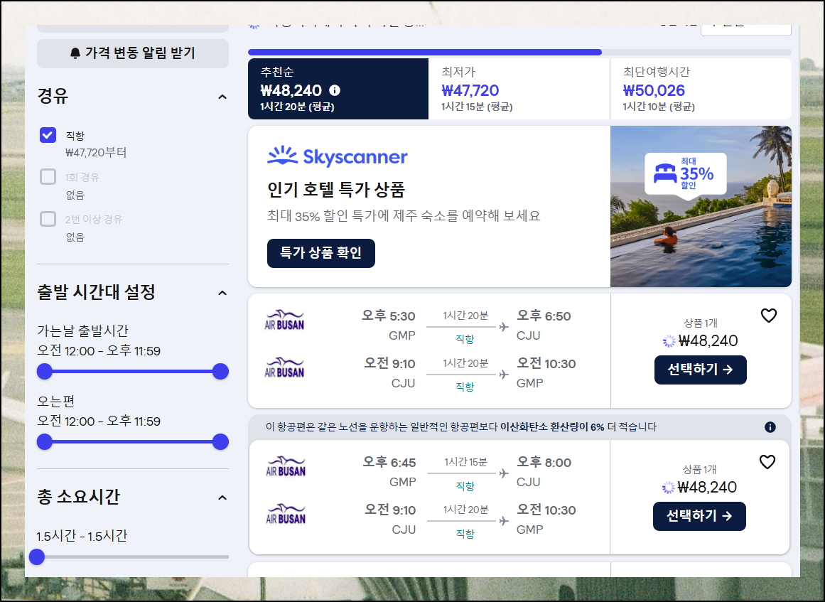 가격비교 사이트를 통해 최적의 방법으로 비행기표를 찾아보았습니다. 제주항공권처럼 국내선을 이용할 때는 직항 여부를 반드시 확인하세요. 싸게 보이는 경유편은 시간도 더 걸리고 숨은 비용도 있을 수 있어요.