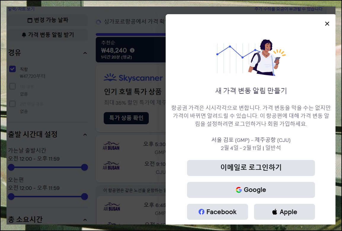 원하는 가격대의 제주항공권을 찾지 못했다면 가격 변동 알림을 설정해보세요. 시스템이 자동으로 가격을 모니터링하다가 싸게 구입할 기회가 오면 즉시 알려줍니다. 알림을 받으면 빠르게 예약하는 식의 방법을 이용해보세요.