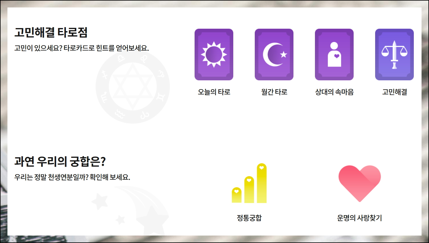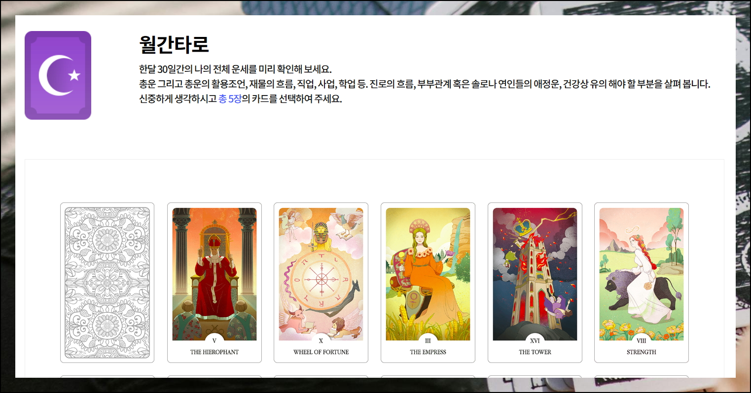 2024년을 위한 운세 서비스로 타로카드의 의미를 자세히 알아볼 수 있습니다. 신중한 마음으로 5장을 선택하면서 운명의 실마리를 찾아보세요. 우리가 선택한 것에 담긴 그림은 당신의 미래를 보여주는 거울이 되어줄 거예요.