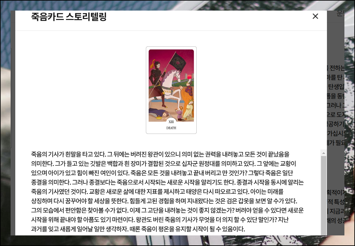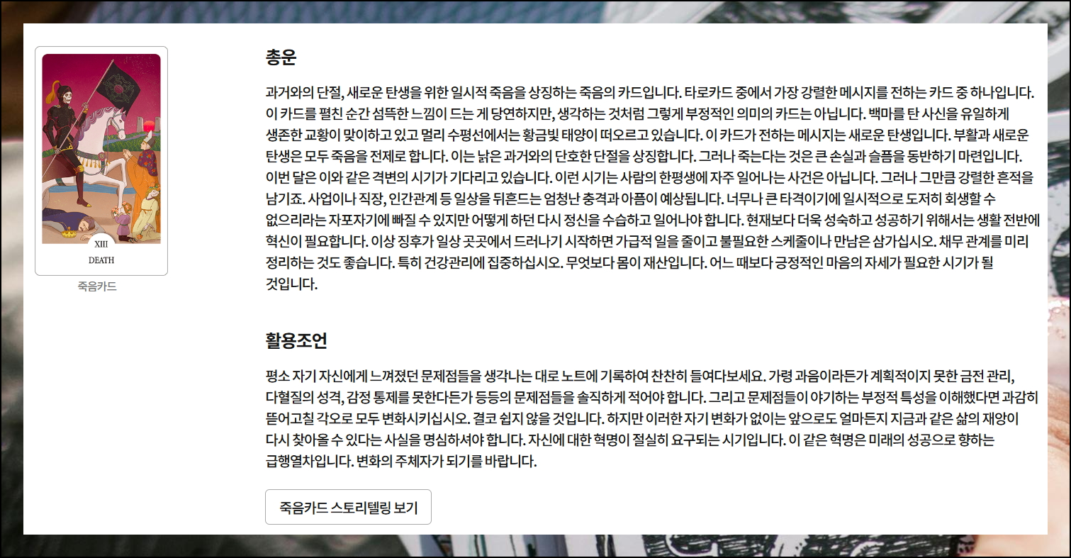 죽음 카드가 보여주는 총운과 함께, 긍정적인 기운을 활용하는 방법도 알아볼 수 있어요. 카드의 깊은 의미는 스토리텔링 보기를 통해 확인해보세요. 각 그림이 가진 설명을 통해 더 깊은 이해가 가능합니다.