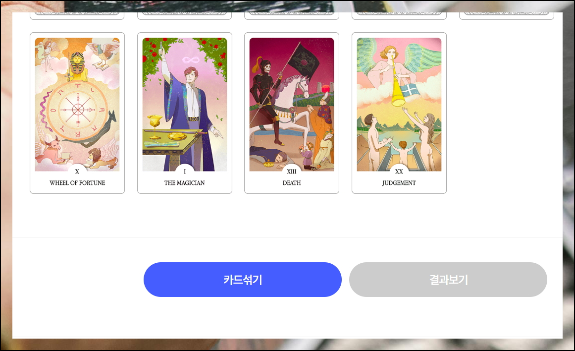 뒷면이 보이는 카드들 중에서 5장을 골라보세요. 모든 선택이 끝나면 결과보기를 통해 당신의 운명이 펼쳐질 거예요. 타로의 신비로운 그림 속에는 당신을 위한 메시지가 숨겨져 있습니다.