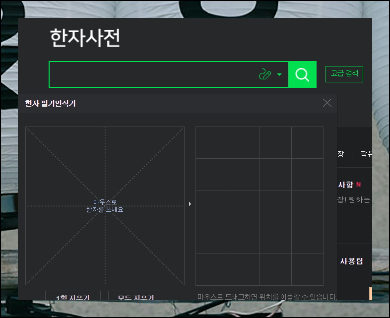 네이버 한문사전을 효과적으로 활용하려면 검색창 오른쪽의 필기 아이콘을 활용해보세요. 클릭하면 한자 필기인식기가 실행되는데, 이는 매우 직관적인 검색 방법입니다.