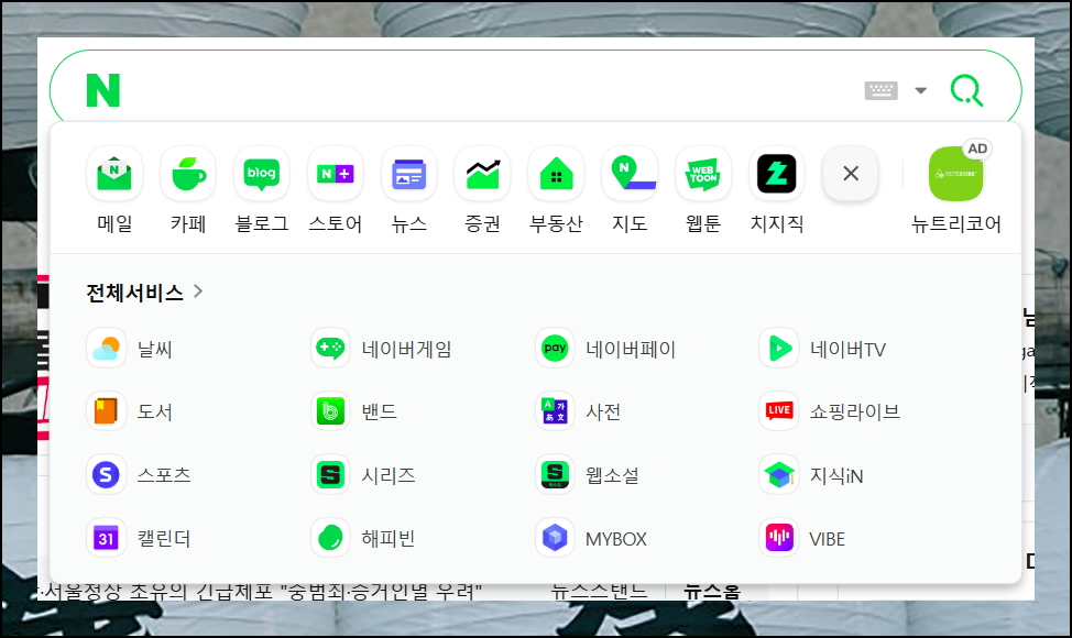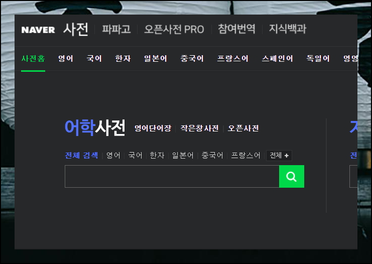 많은 사람들이 일상적으로 사용하는 네이버, 다음, 구글과 같은 검색 포털 중에서 네이버에 접속해보세요. 검색창 하단의 전체 서비스 메뉴를 통해 다양한 서비스로 이동할 수 있는데, 사전 서비스도 여기서 찾을 수 있습니다.