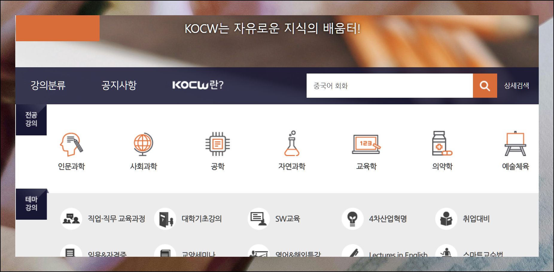 다양한 학문 분야가 한눈에 들어오죠? 화면에 나타난 검색창에서 "중국어 회화" 입력하여 검색해 보세요. 초급이나 입문 수준의 회화를 찾고 계시다면 간단한 인사말부터 시작하는 강의를 추천해드려요.