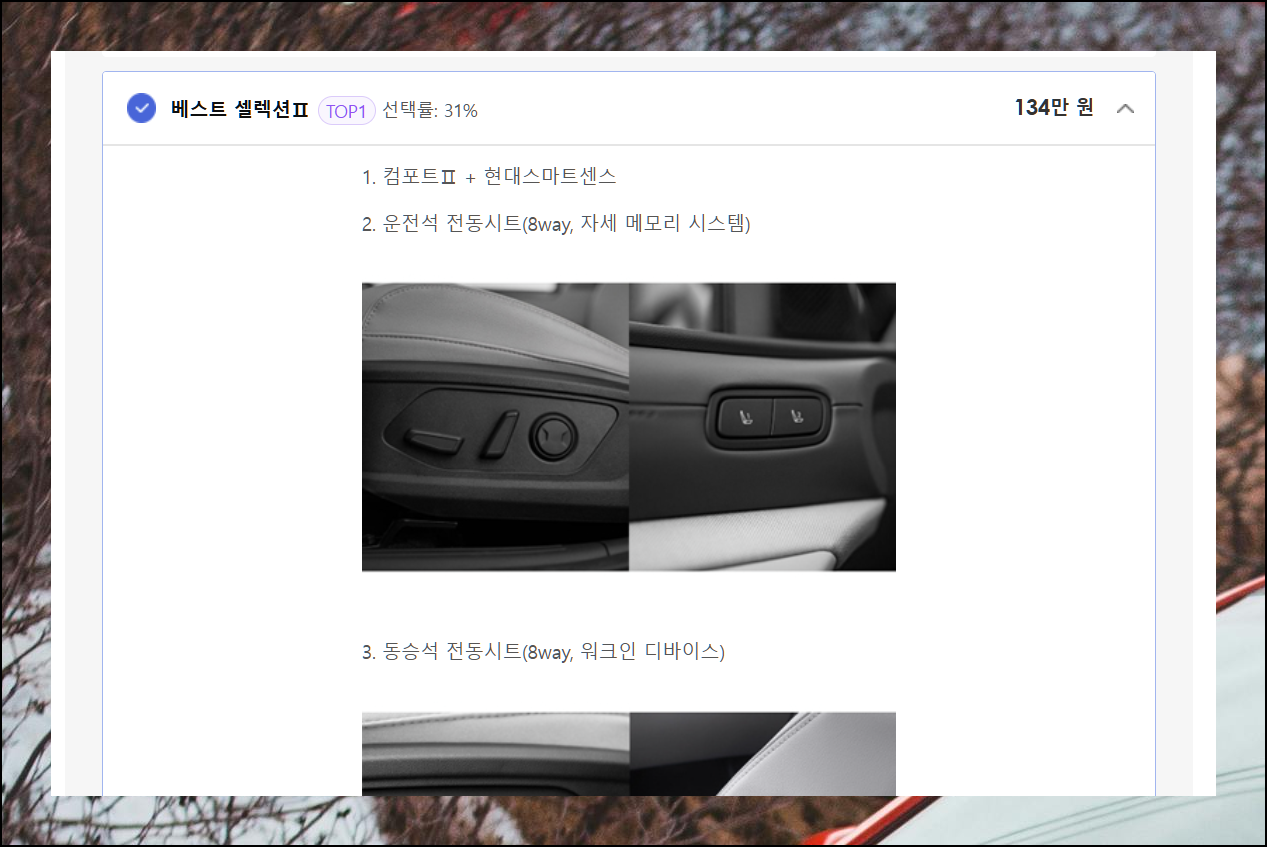 현대자동차의 각 옵션의 구체적인 기능이 궁금하다면 가격표 옆 화살표를 눌러보세요. 상세한 설명을 통해 각 옵션의 특징을 파악할 수 있습니다.