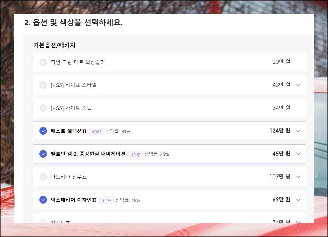 차량 구매시 옵션 선택은 매우 중요합니다. TOP 마크가 있는 옵션들은 많은 고객들이 선택한 인기 옵션이에요. 이를 참고하면 선택에 도움이 될 거예요.