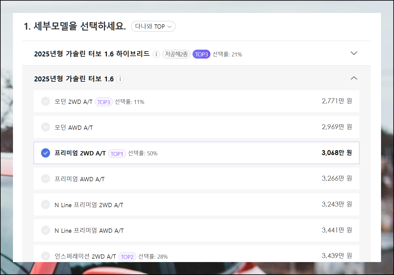 지금까지 선택한 모든 조건들이 반영된 가격표를 확인할 수 있습니다. 이 금액이 실제 구매 가격과 거의 유사하기 때문에 차량 구매를 계획 중일 때 유용하게 사용할 수 있어요.
