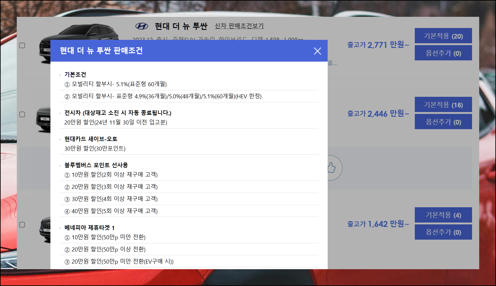 종류별로 다양한 할인 혜택이 준비되어 있어요. 전시차 구매나 각종 이벤트 참여로 추가 할인을 받을 수 있습니다. 앞서 확인한 판매조건을 꼼꼼히 살펴보고 적용하면 좋아요.