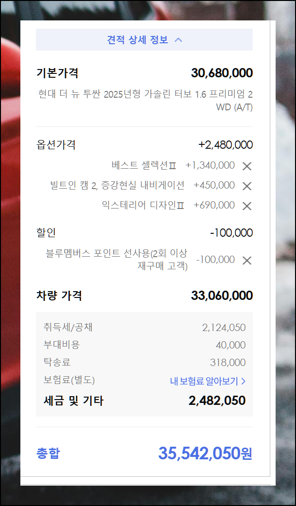 지금까지 선택한 모든 조건들이 반영된 가격표를 확인할 수 있습니다. 이 금액이 실제 구매 가격과 거의 유사하기 때문에 차량 구매를 계획 중일 때 유용하게 사용할 수 있어요.