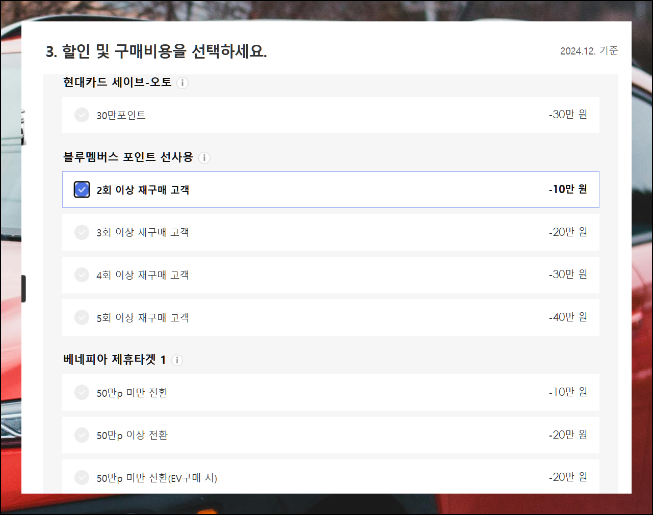 종류별로 다양한 할인 혜택이 준비되어 있어요. 전시차 구매나 각종 이벤트 참여로 추가 할인을 받을 수 있습니다. 앞서 확인한 판매조건을 꼼꼼히 살펴보고 적용하면 좋아요.