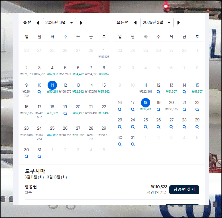 티켓 검색을 위해서는 여행 정보 입력이 가장 중요합니다. 일본여행을 기준으로 설명해드릴 텐데, 여기서 꿀팁 하나를 알려드릴게요. 특정 날짜가 아닌 한 달 전체로 검색하면 더 저렴한 항공권을 찾을 수 있어요. 가격비교가 쉽도록 3월을 선택해서 알아볼까요?