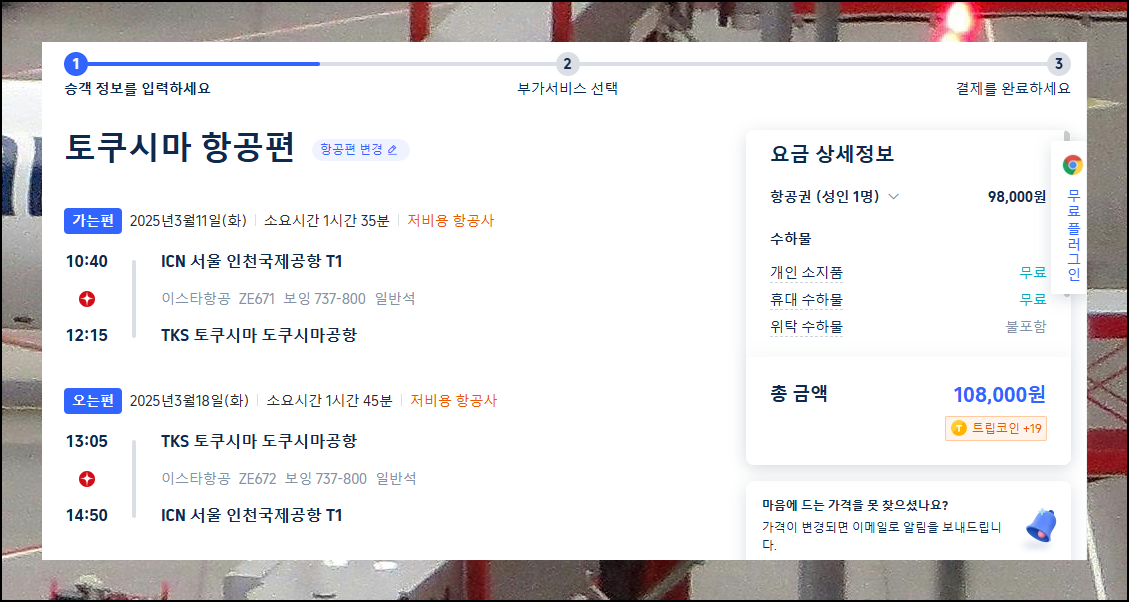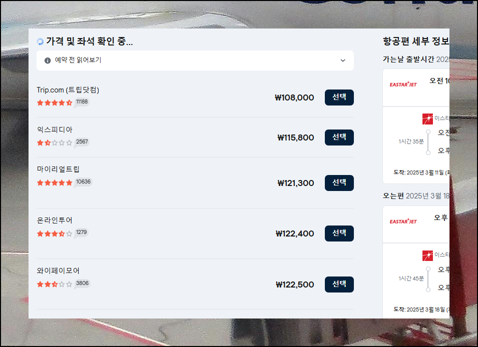 선택한 항공권의 정보와 우리가 찾은 금액이 맞는지 꼼꼼히 확인해주세요. 모든 내용이 일치한다면 예약 버튼을 눌러 예약을 완료하시면 됩니다. 가격비교 사이트에서 보았던 금액과 동일한지도 확인해보세요.