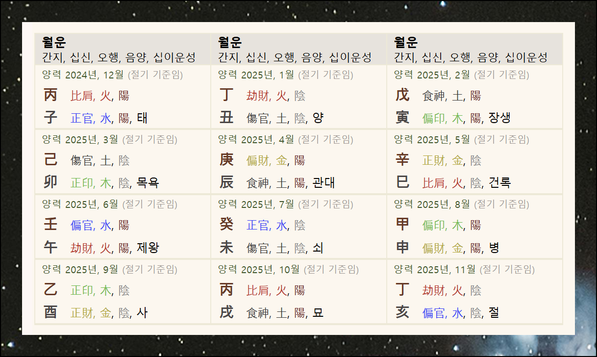 매달의 운세도 만세력 풀이로 쉽게 확인이 가능해요. 목, 화, 토, 금, 수를 각각 다른 색으로 보여주기 때문에 한눈에 알아볼 수 있어요. 달마다 변화하는 운세의 흐름을 파악하면서 계획을 세워보세요.