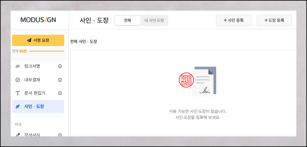 로그인 후에는 화면 왼쪽에서 다양한 메뉴를 만날 수 있습니다. 사인과 도장 메뉴를 찾아 클릭하고, 화면 중앙의 추가하기 버튼을 눌러주세요. 만들기 화면으로 이동하면 바로 이용할 수 있는 전용 프로그램이 나타납니다. 직관적인 인터페이스를 탑재하고 있기 때문에 배우지 않아도 누구나 쉽게 만들기 가능합니다.