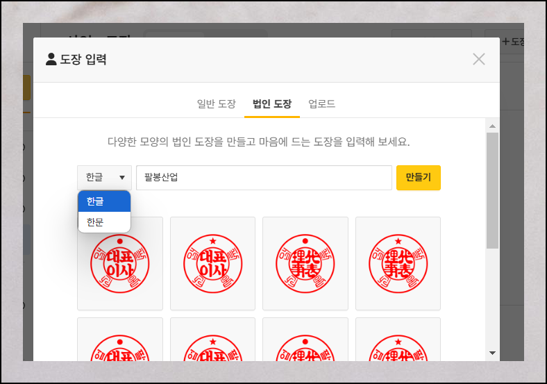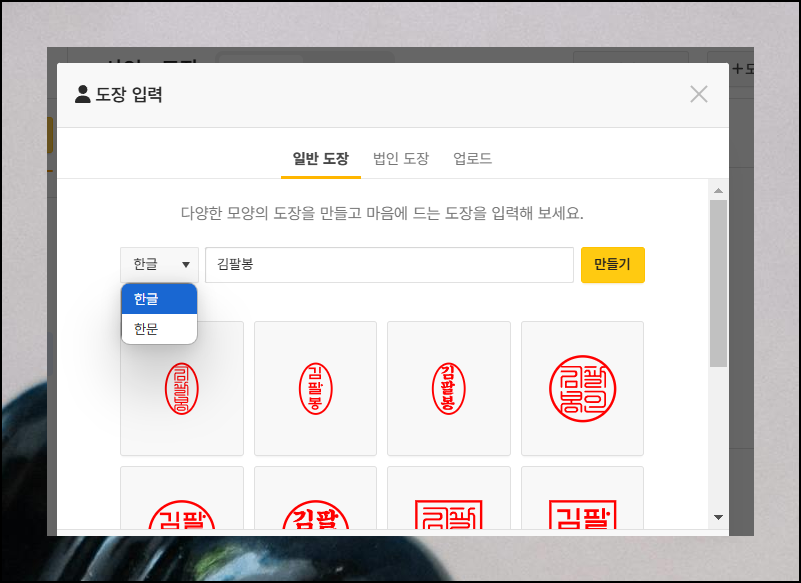 법인용 도장도 제작할 수 있어요. 회사명을 적으면 한글과 한문으로 된 결과물을 얻을 수 있습니다. 무료도장 서비스로 회사의 특성에 맞는 디지털 서명 이미지를 만들기 시작해보세요.