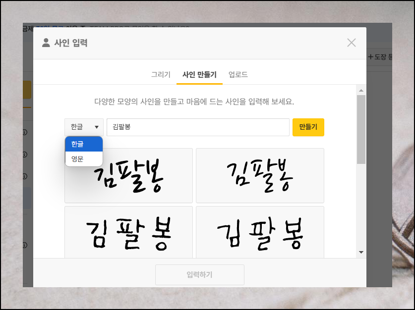 이름을 입력하면 프로그램이 자동으로 여러 디자인의 서명을 만들어줍니다. 도장 만들기처럼 쉽고 빠르게 마음에 드는 스타일을 골라보세요.
