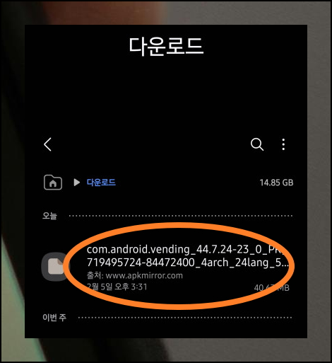 안드로이드 기기에는 파일탐색기가 기본으로 설치되어 있습니다. 이 앱을 실행해서 play 스토어 APK 파일이 있는 곳으로 이동해 주세요. 보통은 다운로드 폴더에 있을 거예요. 최근 파일 목록에서도 쉽게 찾을 수 있습니다.