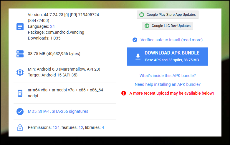 상세 스펙을 볼 때는 안드로이드 OS 버전이 중요합니다. play 스토어의 원활한 사용을 위해서는 권장사양을 따르는 것이 좋아요. Download APK Bundle 버튼을 눌러 파일을 받은 후 휴대폰으로 옮겨주세요. 컴퓨터에서 USB 케이블로 연결하면 더욱 빠르게 전송할 수 있습니다.