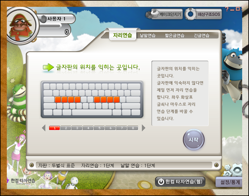 기본적인 자리 익히기부터 낱말, 짧은글, 긴글까지 단계별로 연습이 가능합니다. 지루함을 덜어주는 케이크 던지기와 해상구조 SOS 게임도 준비되어 있어요.
