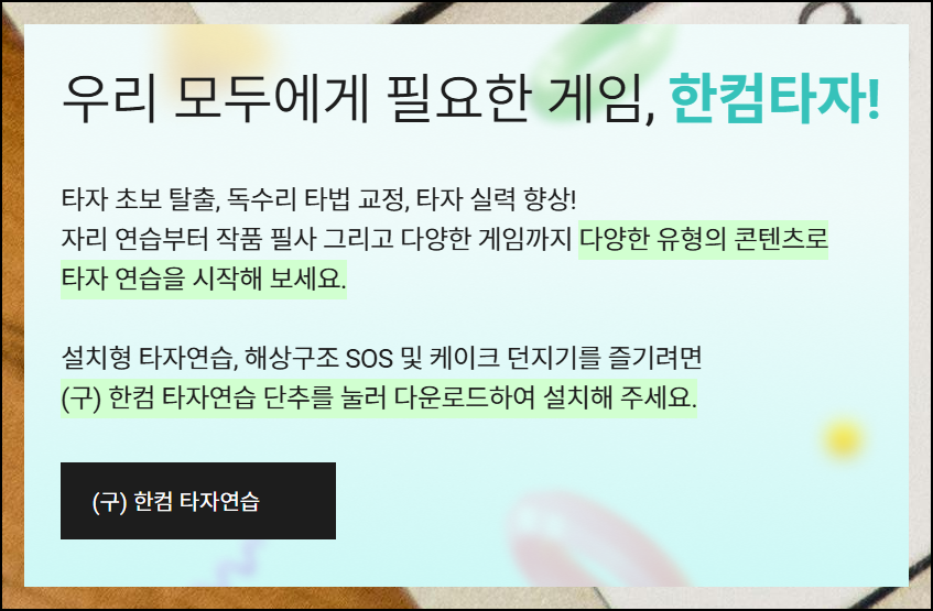 국내 최고의 워드프로세서 기업인 한글과컴퓨터에서 제공하는 무료 타자연습 프로그램을 소개합니다. 온라인과 오프라인 모두 이용할 수 있어요. 개인적으로 인터넷 연결 없이도 활용 가능한 오프라인 버전을 더 좋아합니다. 통계 기능과 게임 서비스를 제공하기 때문이에요.