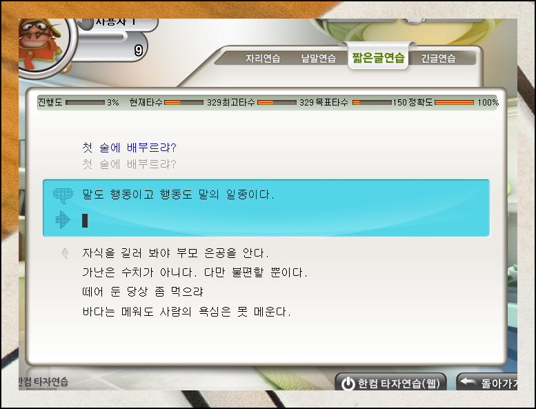 한글 타자연습 프로그램에서는 짧은 글 연습을 하는 경우 좀 더 많은 지표를 통해 실력 향상을 확인할 수 있어요. 이정도 되면 자신의 타이핑 속도와 정확도가 눈에 띄게 좋아지는 것을 경험할 수 있습니다.