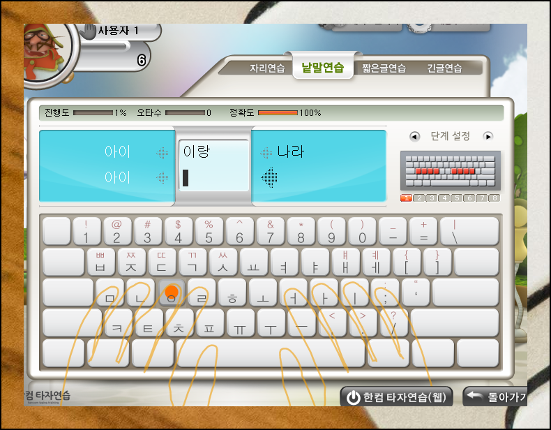 처음에는 각 손가락의 위치와 담당 키를 익혀야 합니다. 그림으로 상세히 설명되어 있어 기본적인 사용방법을 쉽게 익힐 수 있어요. 진행 상황과 정확도도 실시간으로 확인 가능합니다.